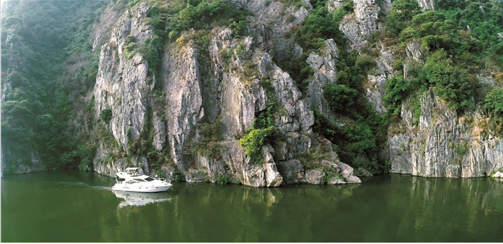 乘坐在快艇上乘風(fēng)破浪,在江面上疾馳,兩岸的青山巍峨聳立,偶有成群的白鷺在江面上拍著翅膀飛過,不遠(yuǎn)處還有農(nóng)舍、田園,眼前的景色就像一幅優(yōu)美的山水畫。唐代名相張九齡就在其詩作《湞陽峽》中寫道:“行舟傍越岑,窈窕越溪深。水暗先秋冷,山晴當(dāng)晝陰”,表現(xiàn)了峽谷的幽深。即將開通的廣樂高速,也有架橋在江面上經(jīng)過,那巨大高聳的橋梁,本身也是一景。現(xiàn)代化的橋梁與古樸的江景相映成趣,“一橋飛架南北”的景觀讓人嘆為觀止。景區(qū)所提供的快艇也是全新的,里面電視、音響、洗手間、酒吧等一應(yīng)俱全,與友人在這里一邊品茶一邊欣賞兩岸景色,美哉快哉!